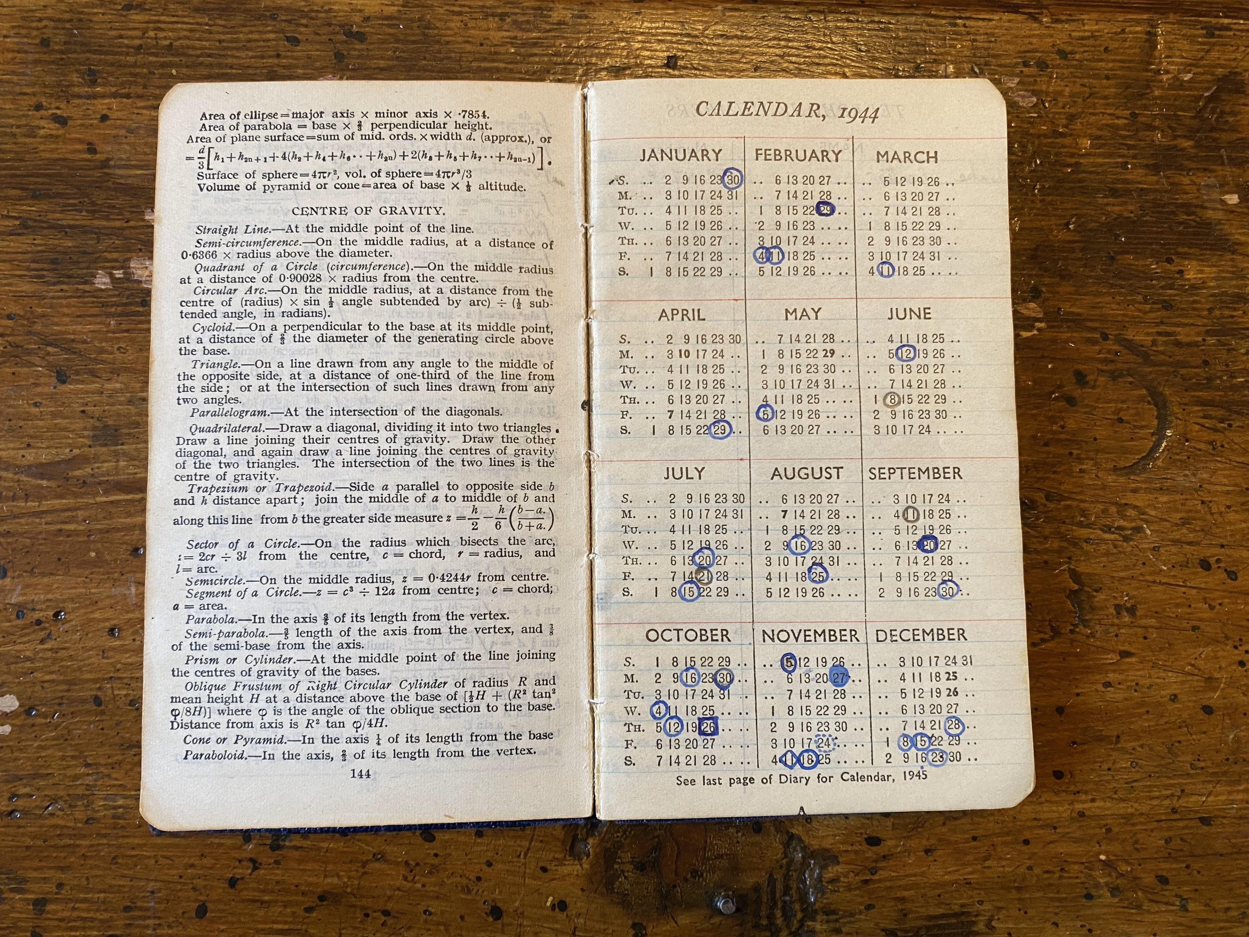 One clue eventually helped to explain it all. Scattered dates are circled on the diary’s full year calendar page, one to five in blue ink every month. (Three black circles mark family birthdays.) Oddly resembling a woman tracking her monthly cycle, they actually line up with a phrase Keith repeats on different days - “had a fit”. In between news of the war, his job and family events, Keith is tracking his epileptic seizures.